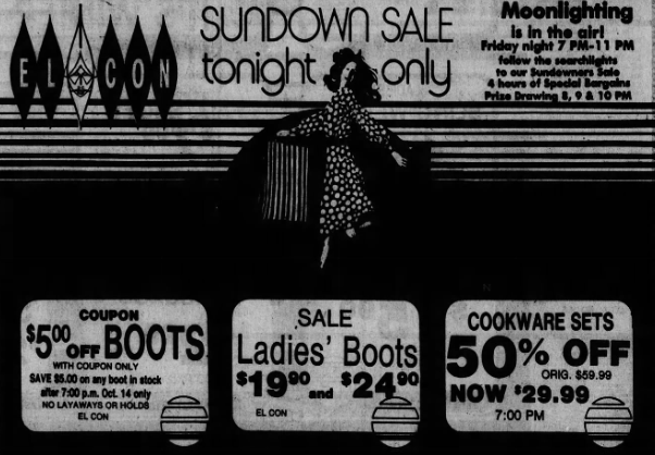 El Con Mall in Tucson, AZ, was one of many Tucson retail stores that utilized searchlight advertising. On Friday, October 14, 1977, for example, the mall hosted a huge “Sundown Sale” from 7 to 11 p.m. “Moonlighting is in the air,” the ad proclaimed. “Follow the searchlights to our Sundowners Sale.” In addition to discounted prices on many items, there were prize drawings at 8, 9, and 10 p.m. Using searchlights for a sundown-themed sale was one of many marketing tactics that El Con Management used to lure people to the mall over the years.