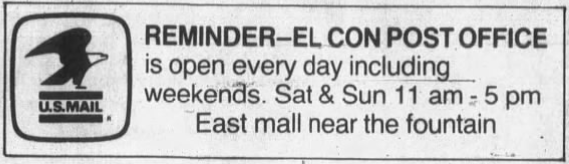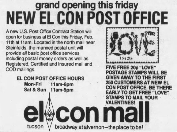 El Con Mall in Tucson, AZ, joined the growing ranks of US malls featuring a post office in 1983. The mall-based branch held its grand opening on February 11th. To celebrate the achievement, five 20¢ Love postage stamps were given to the first 250 customers—just in time to mail a card to their special Valentine. For many Tucsonans, the presence of a post office in the mall achieved two goals at once—It allowed them to shop and run errands in one convenient location. Some even used the El Con Post Office to save lives through contributions to a Chicago-based non-profit organization called Love Letters Inc.
